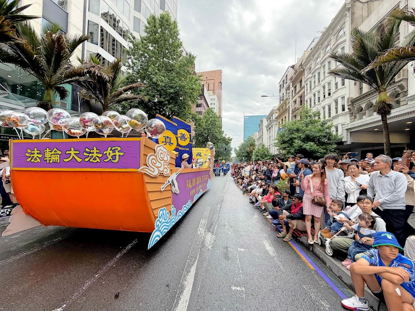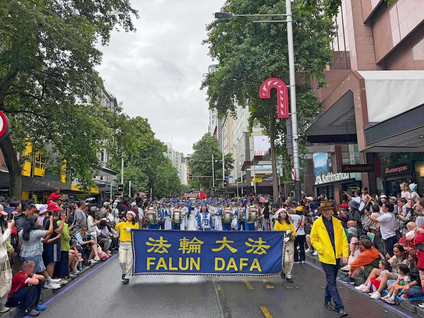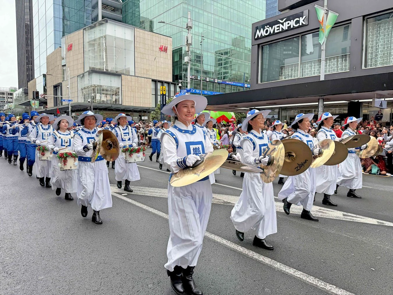 Đoàn nhạc Thiên Quốc gồm các học viên Pháp Luân Đại Pháp đến từ New Zealand và Úc đã được chào đón bằng những tràng pháo tay nồng nhiệt. Mọi người chụp ảnh, khen ngợi trang phục màu xanh trắng của ban nhạc và nhận xét rằng âm nhạc của họ hòa quyện hoàn hảo với không khí lễ hội. Những tấm biểu ngữ “Chân-Thiện-Nhẫn” bắt mắt được trang trí trên xe diễu hành, theo sau là đội múa rồng, vốn là tiết mục mà các em nhỏ rất yêu thích.
