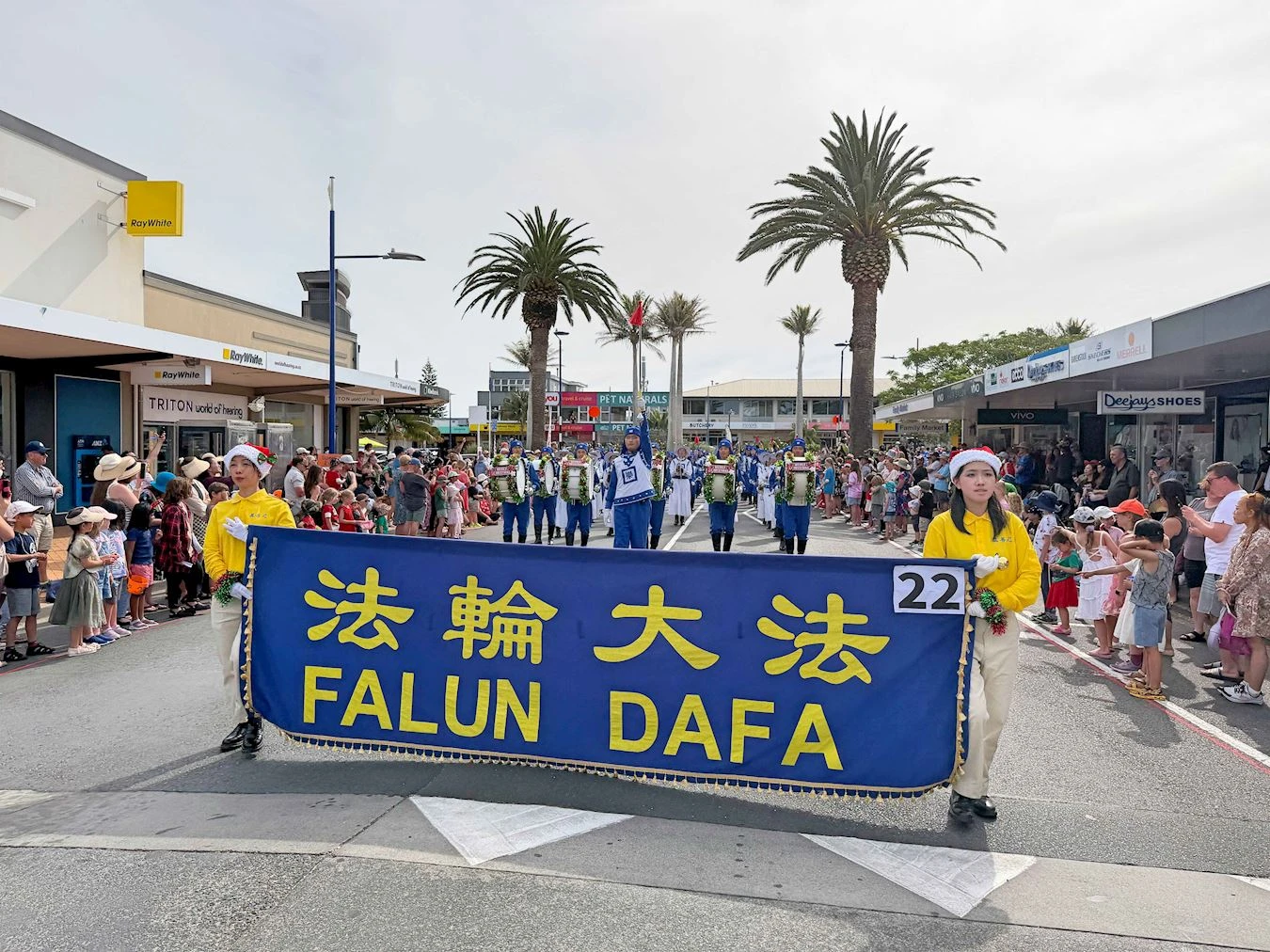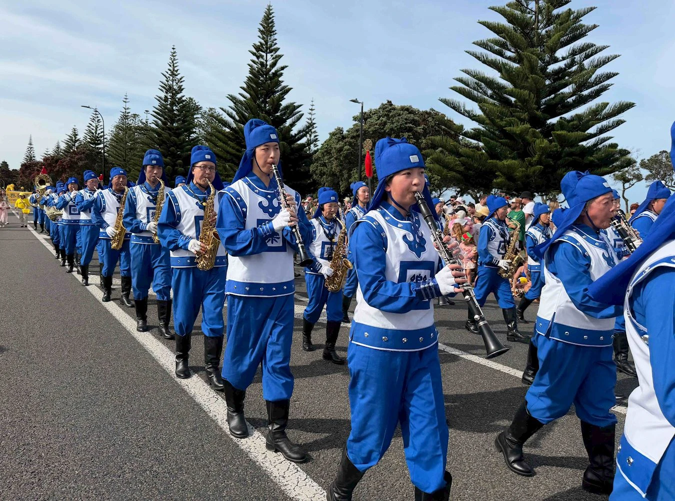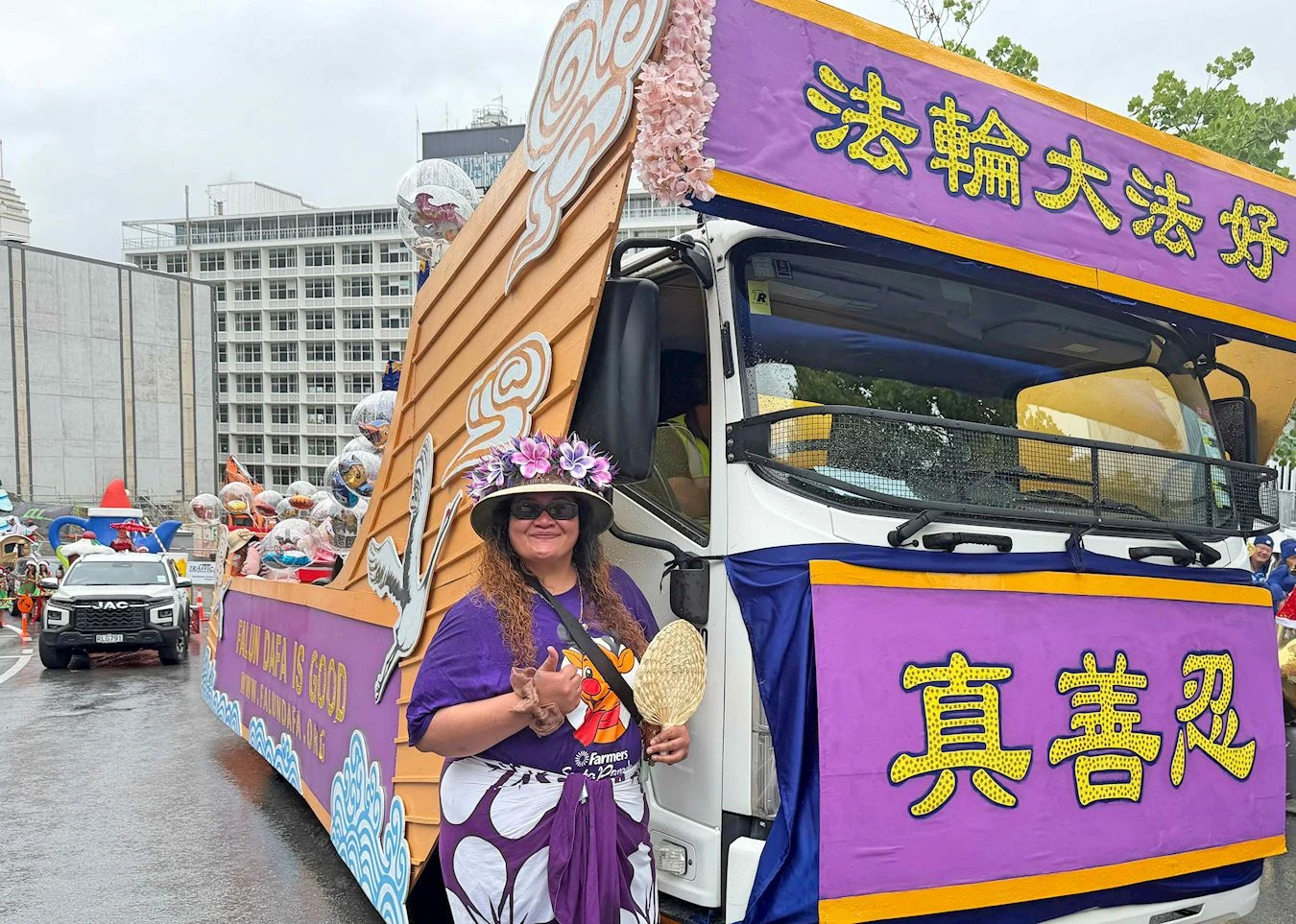 Đoàn nhạc Thiên Quốc gồm các học viên Pháp Luân Đại Pháp đến từ New Zealand và Úc đã được chào đón bằng những tràng pháo tay nồng nhiệt. Mọi người chụp ảnh, khen ngợi trang phục màu xanh trắng của ban nhạc và nhận xét rằng âm nhạc của họ hòa quyện hoàn hảo với không khí lễ hội. Những tấm biểu ngữ “Chân-Thiện-Nhẫn” bắt mắt được trang trí trên xe diễu hành, theo sau là đội múa rồng, vốn là tiết mục mà các em nhỏ rất yêu thích.