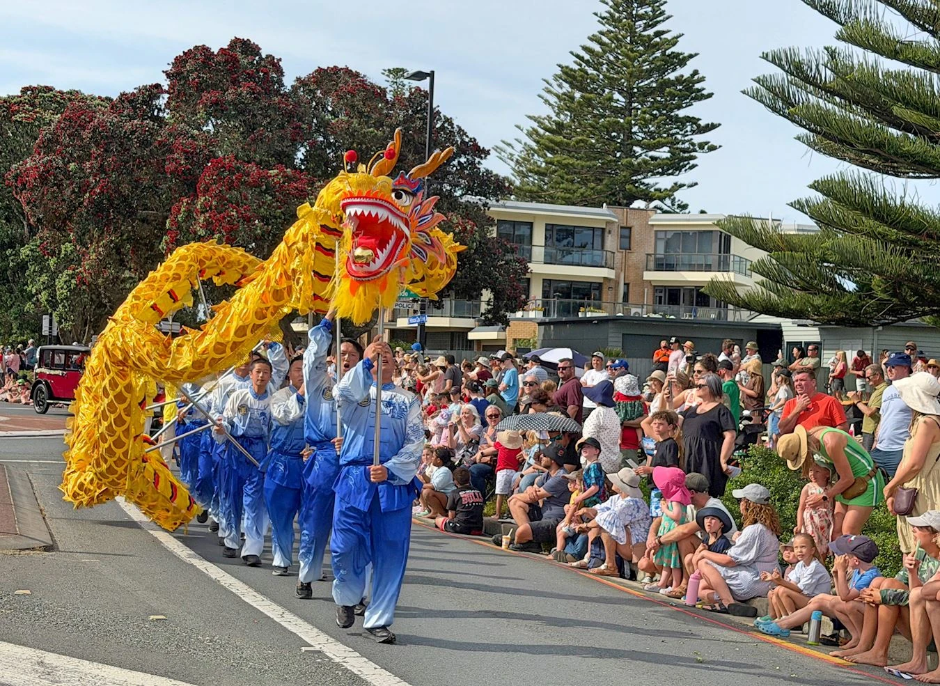 Đoàn nhạc Tian Guo và đội múa rồng tại cuộc diễu hành Orewa hôm 29 tháng 11
