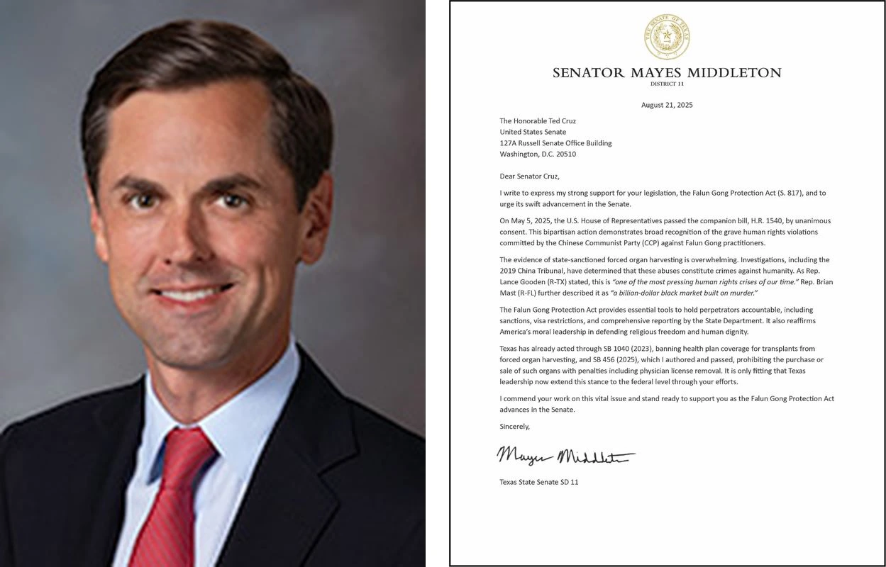 Ông Mayes Middleton, Thượng nghị sỹ Đảng Cộng hòa Khu vực bầu cử số 11 và là Phó chủ tịch Tiểu Ban Giáo dục Đại học Thượng viện Texas, cho biết trong thư: “Bằng chứng của nạn cưỡng bức thu hoạch nội tạng do nhà nước hậu thuẫn đã quá rõ ràng. Các cuộc điều tra, bao gồm Tòa án Luận tội Trung Quốc (China Tribunal) năm 2019, đã xác nhận rằng những hành vi lạm dụng này cấu thành tội ác chống lại nhân loại. Như Hạ nghị sỹ Lance Gooden (R-TX) tuyên bố, đây là ‘một trong những cuộc khủng hoảng nhân quyền cấp bách nhất trong thời đại chúng ta.’ Hạ nghị sỹ Brian Mast (R-FL) mô tả thêm đây là ‘một chợ đen tỷ đô được vận hành trên sự giết chóc.”