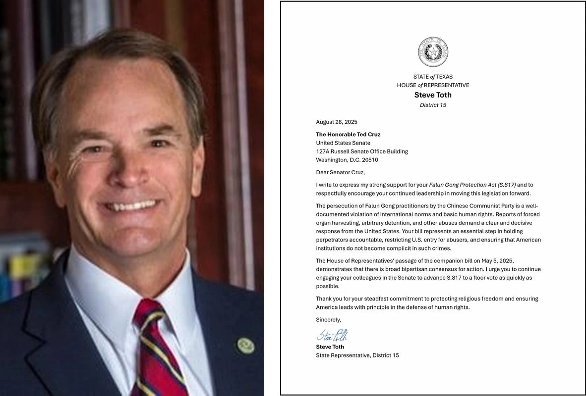 Ông Steve Toth, Hạ nghị sỹ cao cấp đến từ Khu vực bầu cử số 15 của Hạ viện Texas, viết: “Cuộc bức hại của ĐCSTQ đối với các học viên Pháp Luân Công đã vi phạm các chuẩn mực quốc tế và các quyền cơ bản của con người, điều này đã được ghi chép đầy đủ. Những báo cáo về nạn cưỡng bức thu hoạch nội tạng, giam giữ tùy tiện và các hành vi lạm dụng khác yêu cầu một phản ứng rõ ràng và dứt khoát từ Hoa Kỳ.