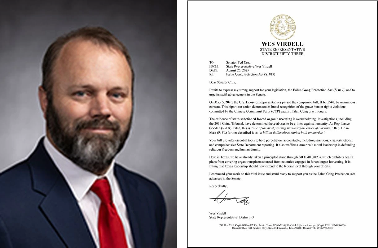 Ông Wes Virdell, nghị sỹ Hạ viện Texas từ Khu vực bầu cử số 53, cũng viết thư cho Thượng nghị sỹ Cruz để ủng hộ Đạo luật Bảo vệ Pháp Luân Công và hy vọng Thượng viện sẽ sớm thông qua.