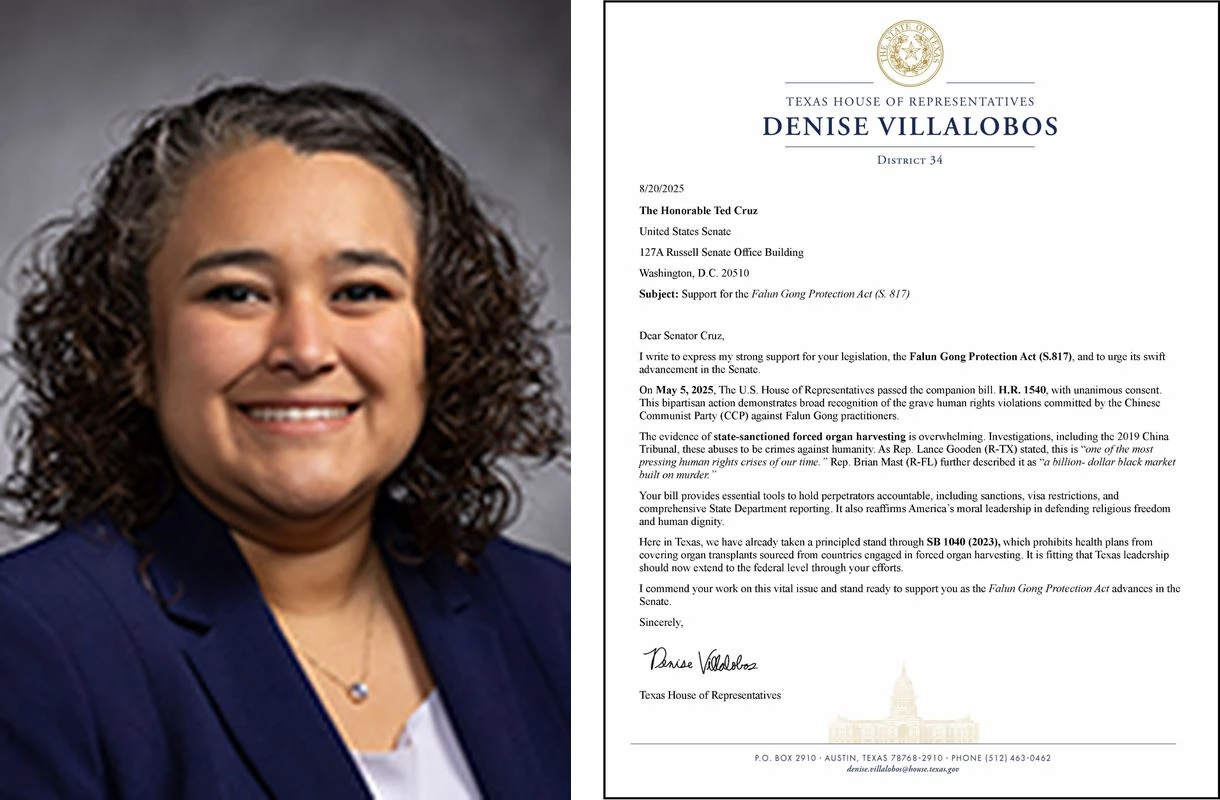 Hạ nghị sỹ Denise Villalobos đến từ Khu vực bầu cử số 34, Texas viết trong thư gửi Thượng nghị sỹ Cruz: “Tôi rất cảm kích trước nghĩa cử của ngài đối với vấn đề quan trọng này và sẵn sàng hỗ trợ khi Đạo luật Bảo vệ Pháp Luân Công được thúc đẩy tại Thượng viện.”