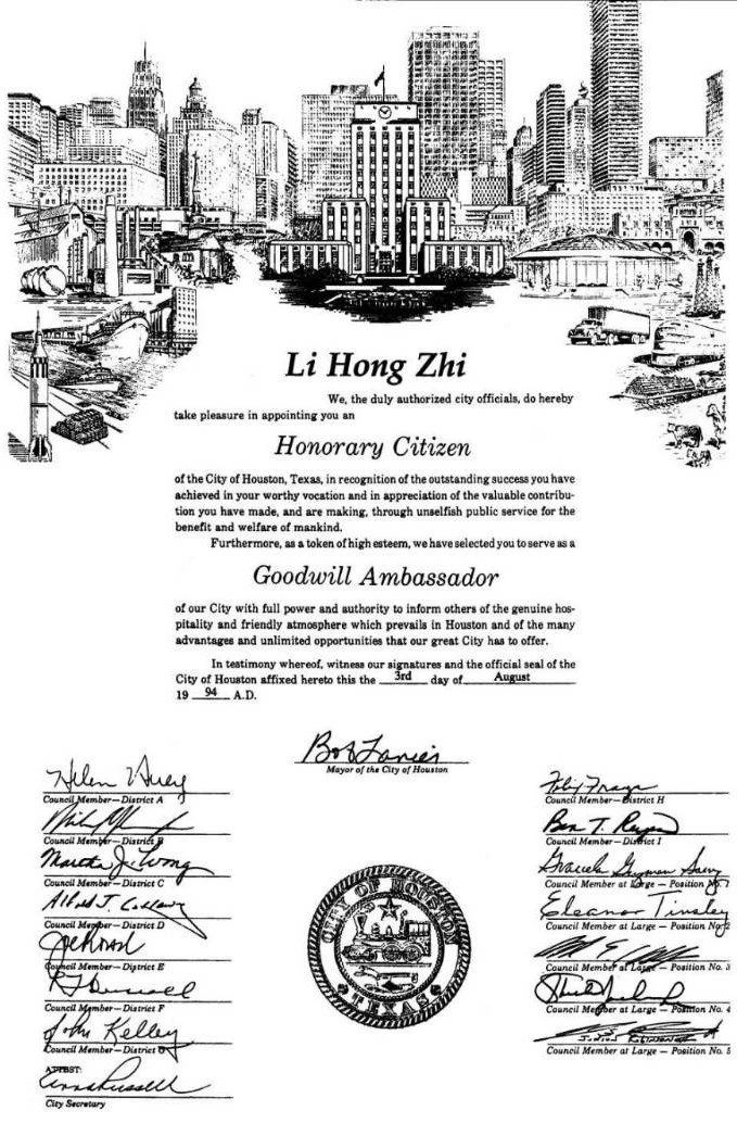 Năm 1994, Chính quyền thành phố Houston, Hoa Kỳ ban hành chứng nhận vinh danh Đại sư Lý Hồng Chí là “Công dân Danh dự của Houston” và “Đại sứ Thiện chí”.