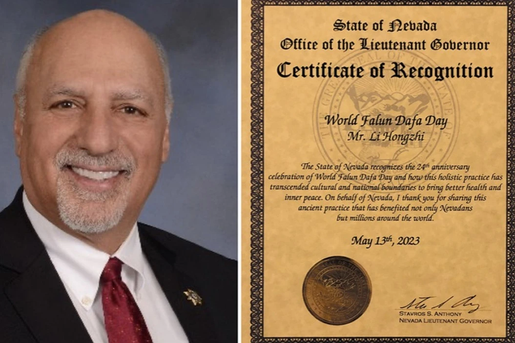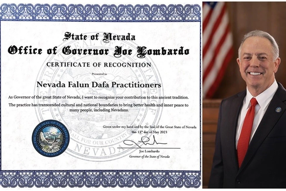 Thống đốc Joe Lombardo và Phó Thống đốc Stavros Anthoy của Nevada trao chứng nhận công nhận đóng góp của Đại sư Lý Hồng Chí và các học viên Pháp Luân Công
