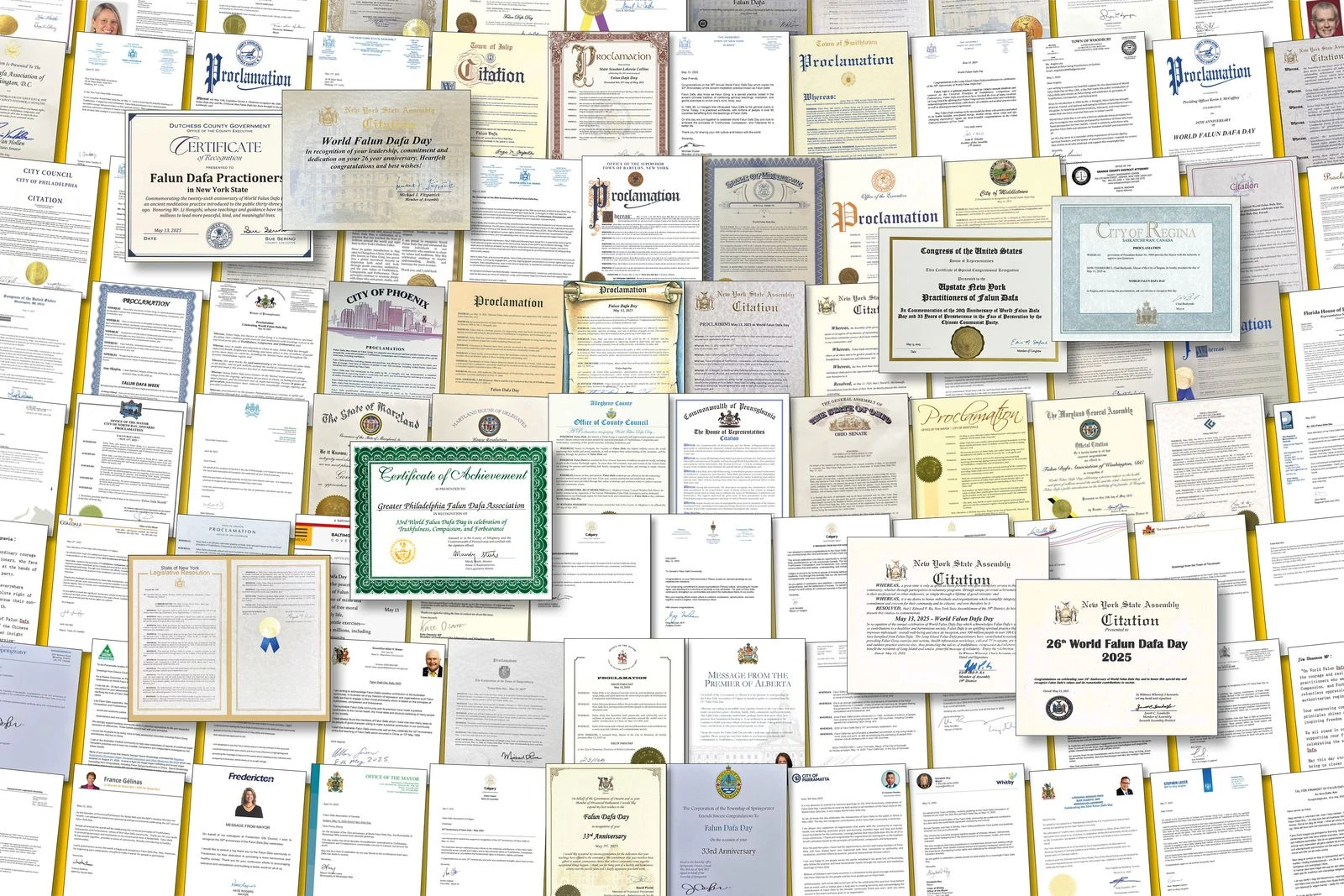 Hàng năm, vào ngày Pháp Luân Đại Pháp thế giới, quan chức và chính phủ các quốc gia gửi thư chúc mừng, tuyên bố “Ngày Pháp Luân Đại Pháp Thế giới”, bày tỏ sự ủng hộ và tôn vinh Pháp Luân Công. Tính đến năm 2025, Pháp Luân Công đã được trao tặng hơn 13.000 bằng khen, thư ủng hộ, và nghị quyết ủng hộ từ các cơ quan lập pháp, Hội đồng thành phố, tổ chức nhân quyền và cộng đồng địa phương trên khắp thế giới.