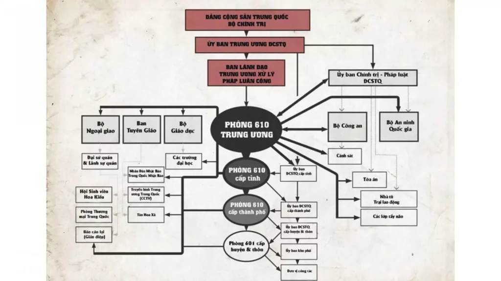 Sơ đồ cơ cấu Phòng 610, từ cơ quan quyền lực của Đảng Cộng sản – Bộ Chính trị – xuống đến các Ủy ban khu phố và Văn phòng làng.