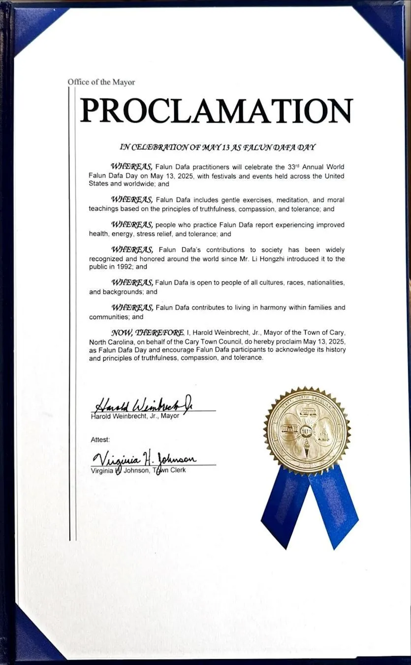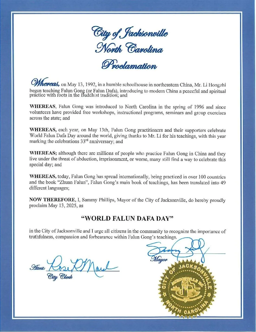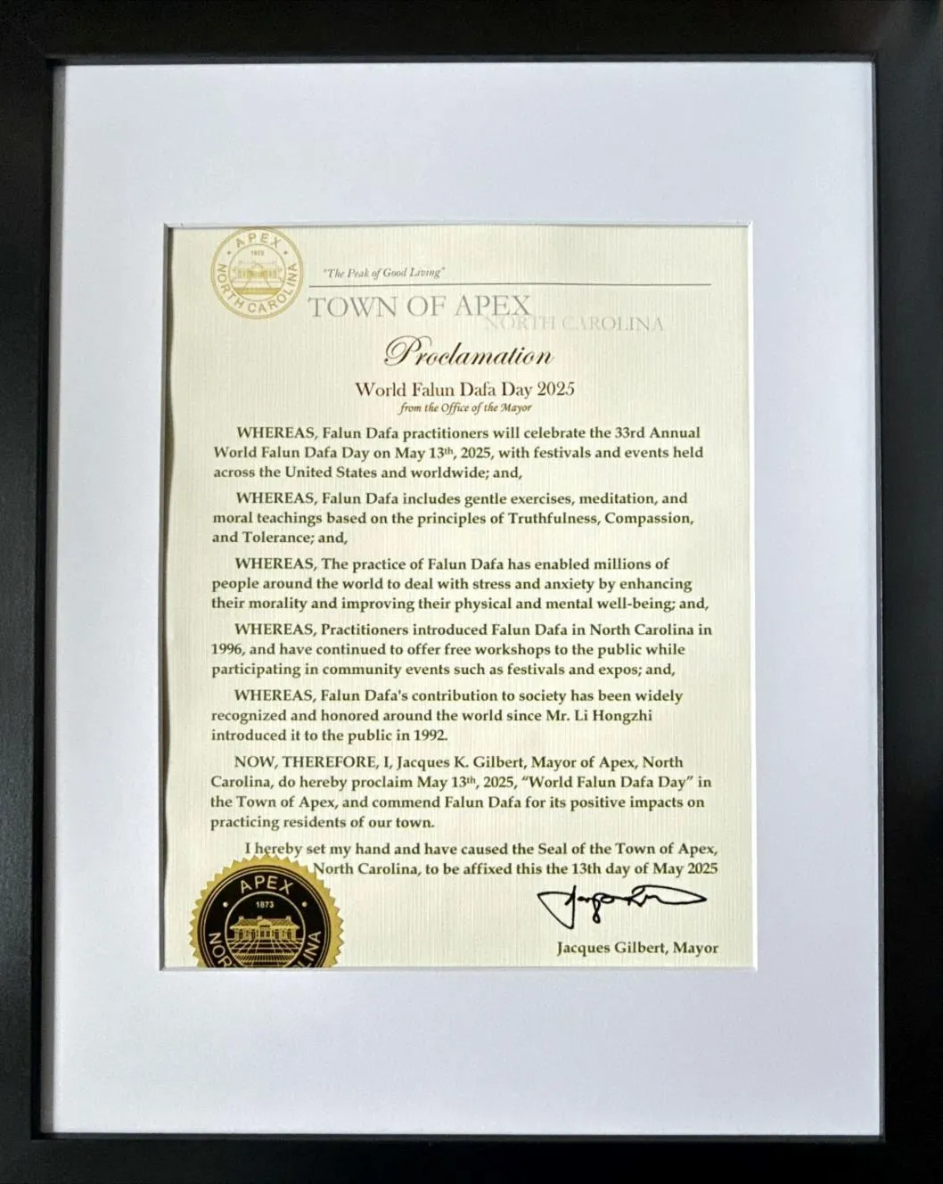 Các thành phố Cary, Apex, và Jacksonville ở Bắc Carolina đã ra thông cáo tuyên bố ngày 13 tháng 5 năm 2025 là “Ngày Pháp Luân Đại Pháp Thế giới”, đồng thời cảm ơn Pháp Luân Đại Pháp vì những đóng góp của pháp môn cho cộng đồng địa phương.