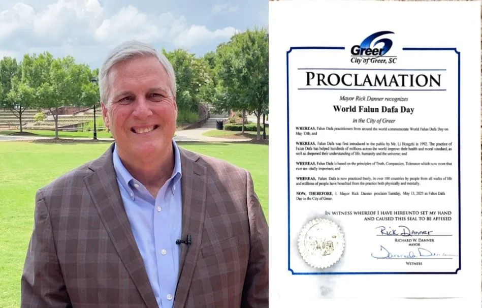 Thị trưởng Rick Danner của Greer, bang Nam Carolina, đã ban hành thông cáo tuyên bố ngày 13 tháng 5 năm 2025 là Ngày Pháp Luân Đại Pháp Thế giới ở thành phố Greer.