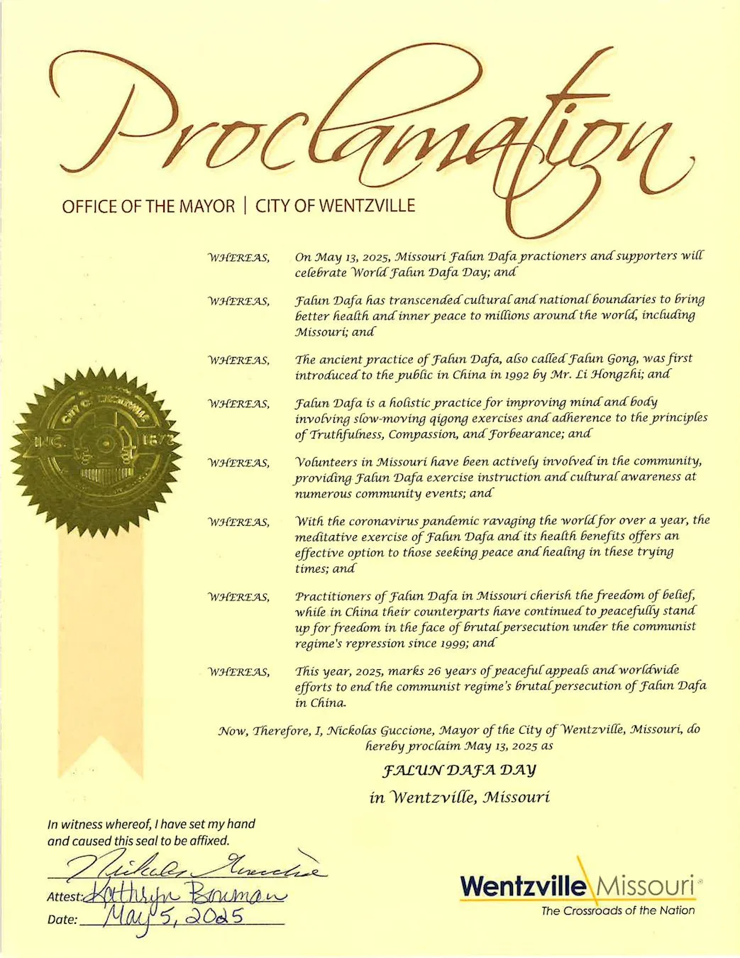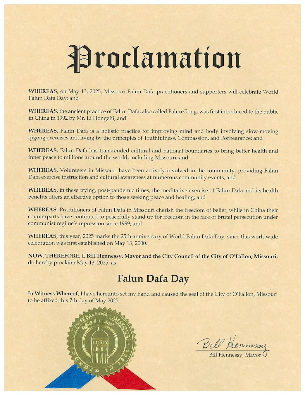 Thị trưởng các thành phố O’Fallon và Wentzville ở Missouri đã ra tuyên bố tôn vinh Pháp Luân Đại Pháp vì đã mang lại thịnh vượng cho cá nhân và cộng đồng, đồng thời công bố ngày 13 tháng 5 năm 2025 là Ngày Pháp Luân Đại Pháp.