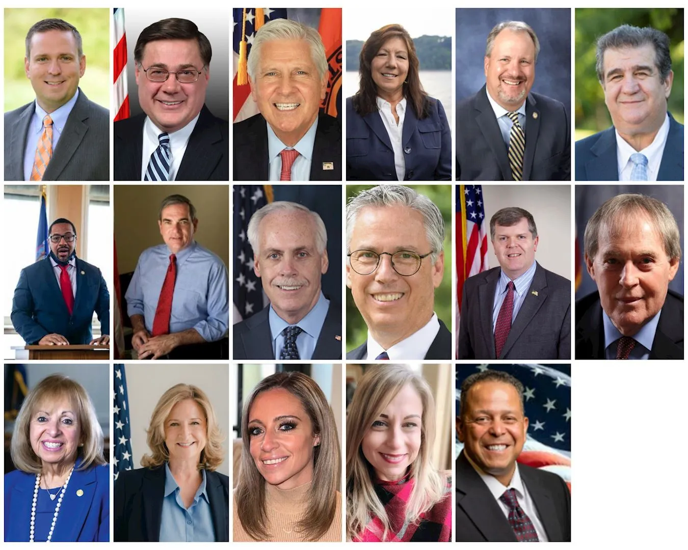 Hàng dưới từ trái sang phải: Thị trưởng Islip Angie Carpenter, Thị trưởng Southampton Maria Z. Moore, Giám sát viên Woodbury Kathryn Luciani, Giám sát viên Suzanne Edzenga của Lumberland, Giám sát viên George Serrano của Middletown.
