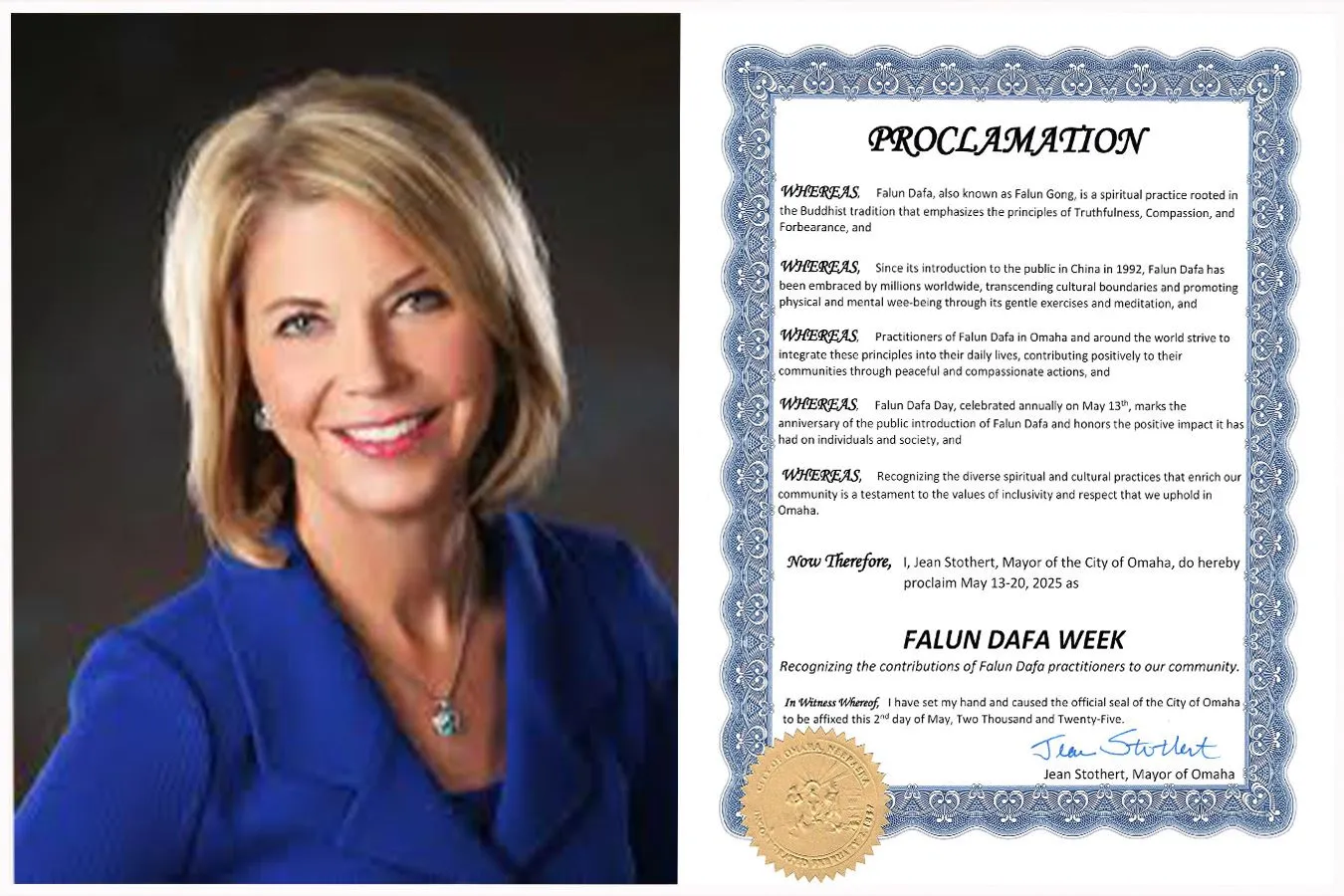 Bà Jean Stothert, thị trưởng Omaha, bang Nebraska, tuyên bố từ ngày 13 đến ngày 20 tháng 5 năm 2025 là “Tuần lễ Pháp Luân Đại Pháp”.