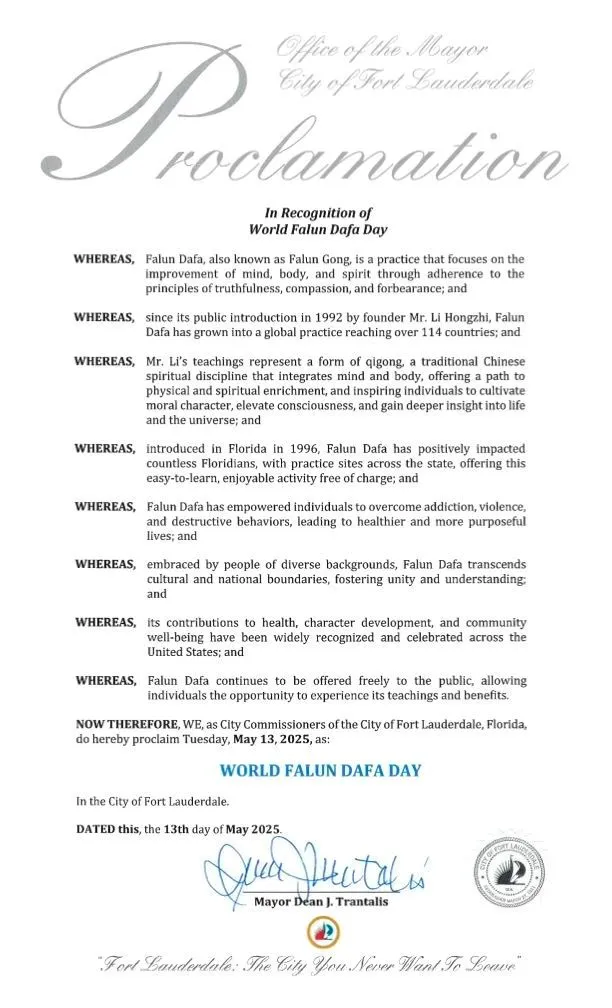 Thị trưởng Dean J. Trantalis của Thành phố Fort Lauderdale, Florida, cùng bốn Ủy viên Hội đồng Thành phố, đã chính thức tuyên bố ngày 13 tháng 5 năm 2025 là “Ngày Pháp Luân Đại Pháp” ở Thành phố Fort Lauderdale.
