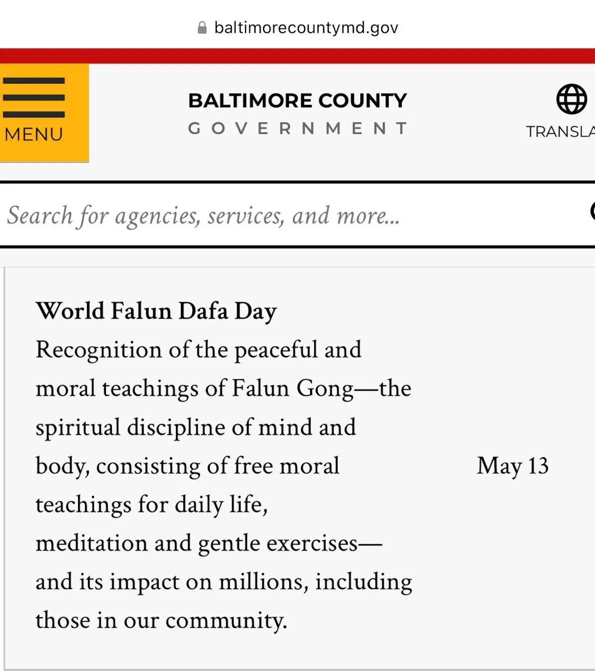 Chính quyền Quận Baltimore thuộc Maryland cũng thông báo trên trang web của Quận rằng ngày 13 tháng 5 năm nay được ghi nhận là Ngày Pháp Luân Đại Pháp Thế giới để tôn vinh những nguyên lý ôn hòa và đạo đức của Pháp Luân Công, môn tu luyện cả tâm lẫn thân. Tuyên bố này cũng cho biết Pháp Luân Công cung cấp miễn phí những nguyên lý đạo đức cho cuộc sống hàng ngày, bao gồm thiền định và các bài công pháp nhẹ nhàng, có tác động (tích cực) đến hàng triệu người, trong đó có cả những cư dân trong cộng đồng của Quận.