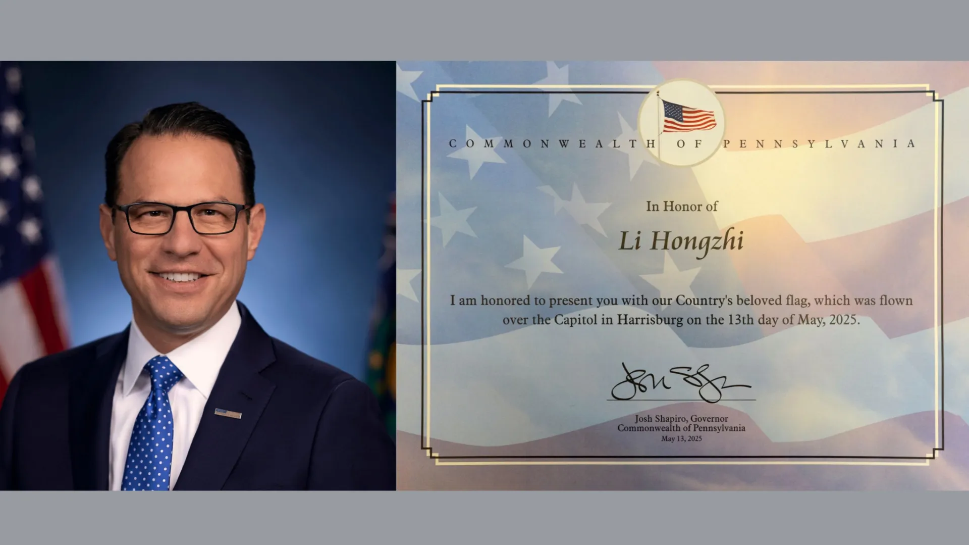 Vào ngày 13 tháng 5, Thống đốc Pennsylvania, ông Josh Shapiro, đã trao tặng bằng khen đặc biệt, trong đó viết: “Tôi rất vinh dự được trao tặng cho Đại sư lá cờ thân yêu của Đất nước chúng ta tung bay trên Tòa nhà Quốc hội ở Harrisburg vào ngày 13 tháng 5 năm 2025”.
