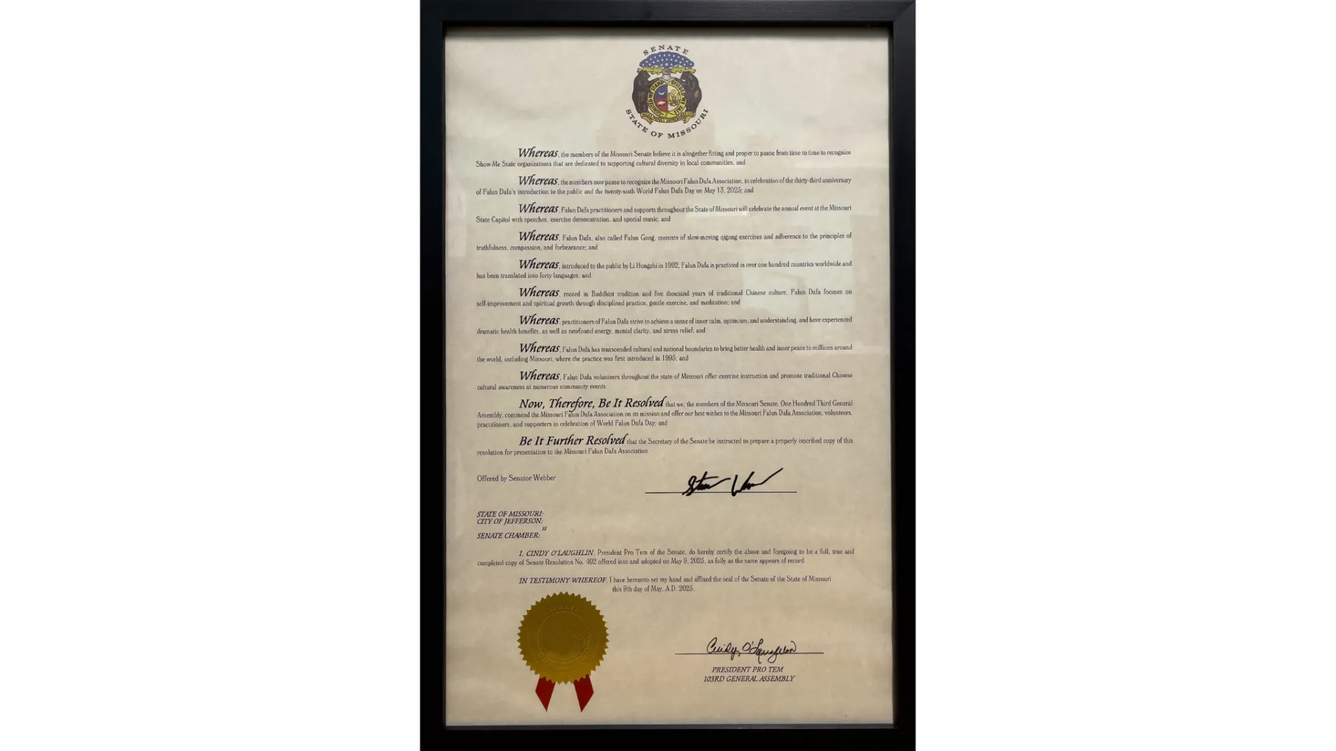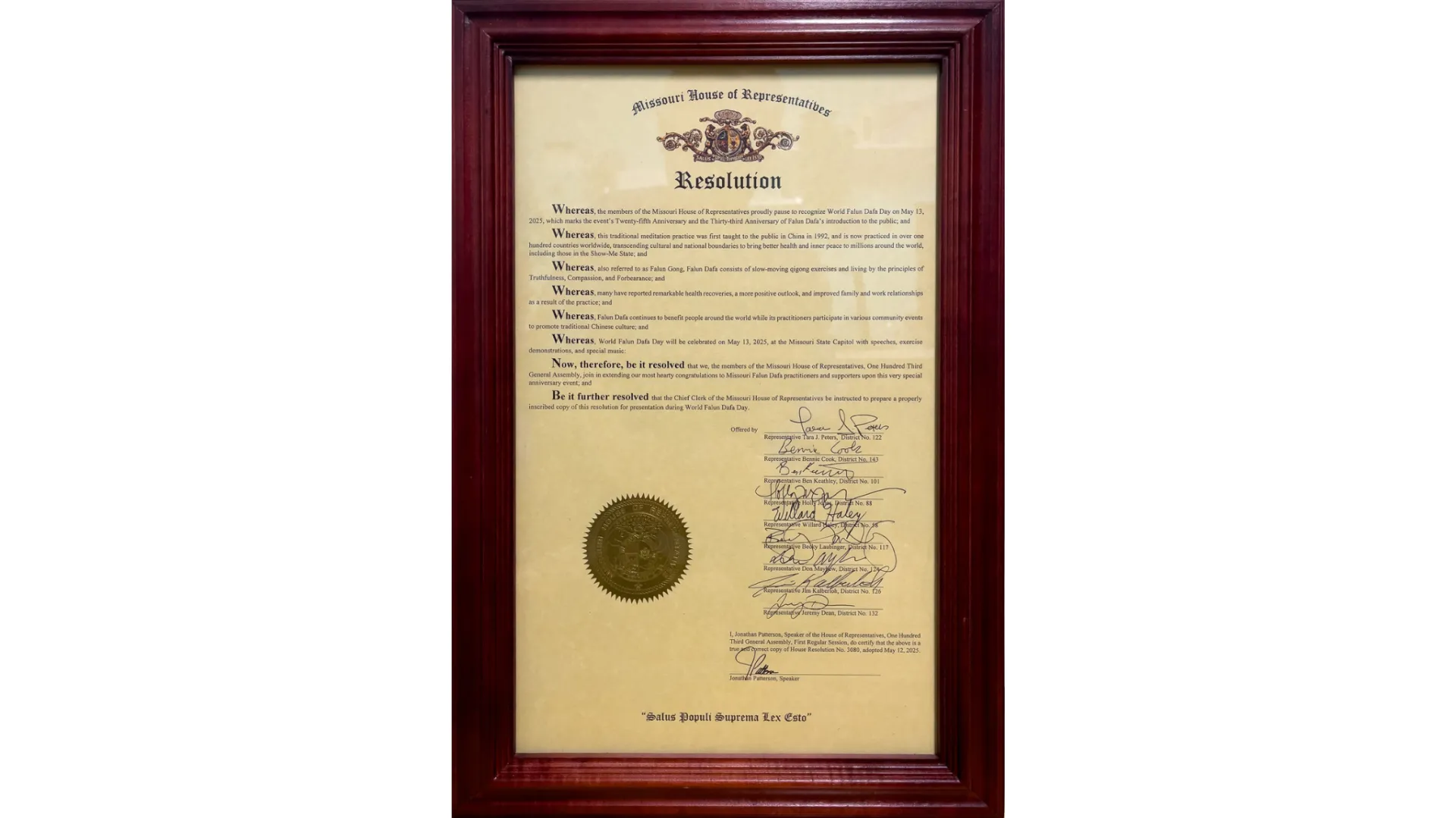 “Pháp Luân Đại Pháp, môn tu luyện và thiền định truyền thống Trung Hoa, đã vượt qua rào cản văn hóa và ranh giới quốc gia để mang lại sức khỏe tốt hơn và sự bình an nội tâm cho hàng triệu người trên khắp thế giới, trong đó có cả ở Missouri này. Các nguyên lý của Pháp Luân Đại Pháp, với cốt lõi là ‘Chân-Thiện-Nhẫn’, tương đồng với những giá trị mà chúng ta, người dân Missouri, trân trọng.”
