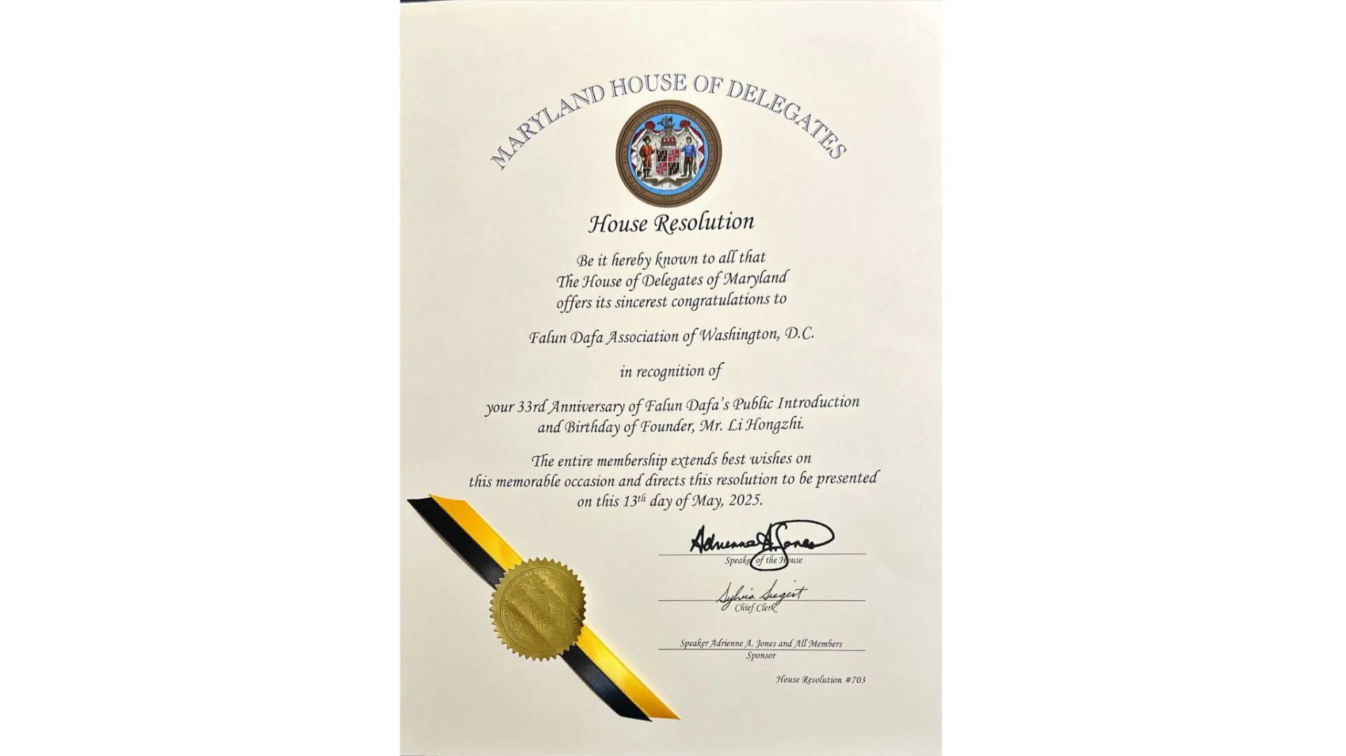 Để kỷ niệm Ngày Pháp Luân Đại Pháp Thế giới lần thứ 26 và 33 năm ngày Pháp Luân Đại Pháp được giới thiệu ra công chúng, Hạ viện Maryland đã ban hành nghị quyết Hạ viện 703 để tôn vinh ngày này và chúc mừng sinh nhật Đại sư Lý Hồng Chí, nhà sáng lập Pháp Luân Đại Pháp.