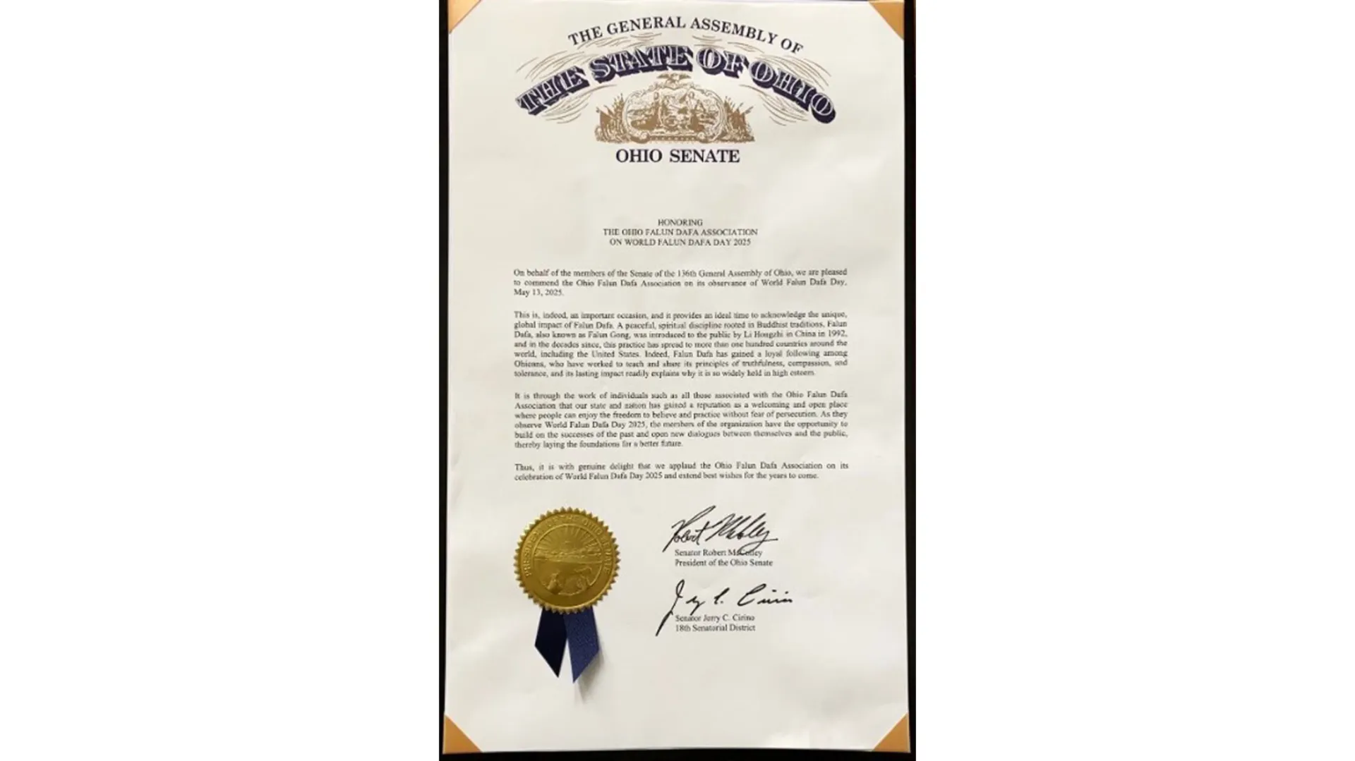 Ông Robert McColley, Chủ tịch Thượng viện Ohio và Thượng nghị sĩ Jerry C. Cirino đã thay mặt cho thượng viện tiểu bang tuyên dương Hiệp hội Pháp Luân Đại Pháp Ohio nhân kỷ niệm Ngày Pháp Luân Đại Pháp Thế giới.