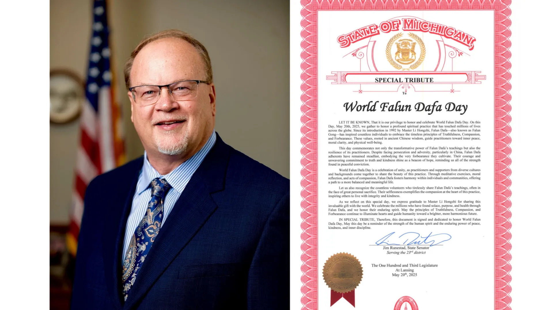 Vào ngày 20 tháng 5 năm 2025, Thượng nghị sĩ Tiểu bang Michigan Jim Runestad đại diện Khu vực 23, đã ban hành một bằng khen đặc biệt để vinh danh các học viên đã thiện tâm giới thiệu Pháp Luân Đại Pháp tới công chúng.