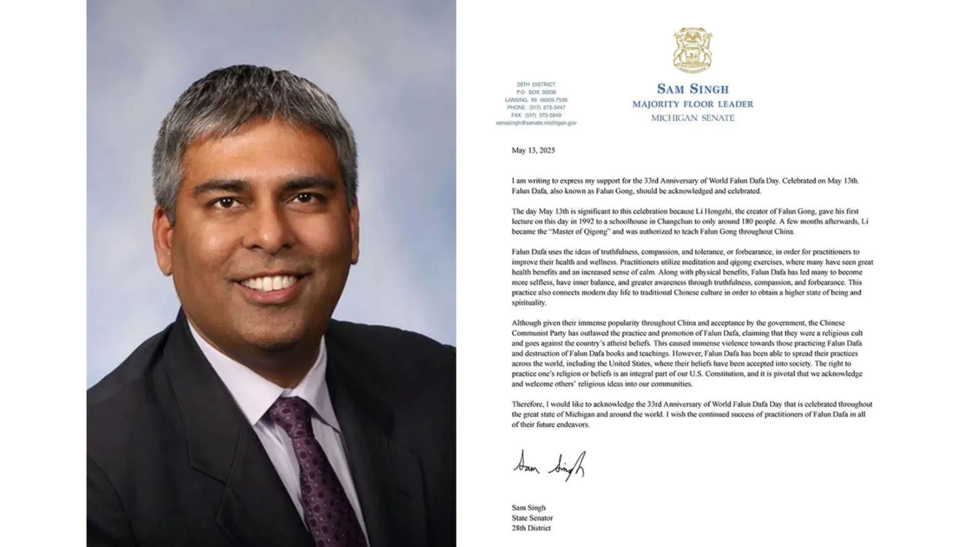 Thượng nghị sĩ Tiểu bang Sam Singh đại diện Khu vực 28, Michigan, đã viết thư để bày tỏ sự ủng hộ đối với Pháp Luân Đại Pháp. Ông viết: “Tôi muốn công nhận Lễ kỷ niệm 33 năm Ngày Pháp Luân Đại Pháp Thế giới được tổ chức trên khắp tiểu bang Michigan và trên toàn thế giới. Xin chúc các học viên Pháp Luân Đại Pháp tiếp tục thành công trong mọi nỗ lực tương lai của họ”.