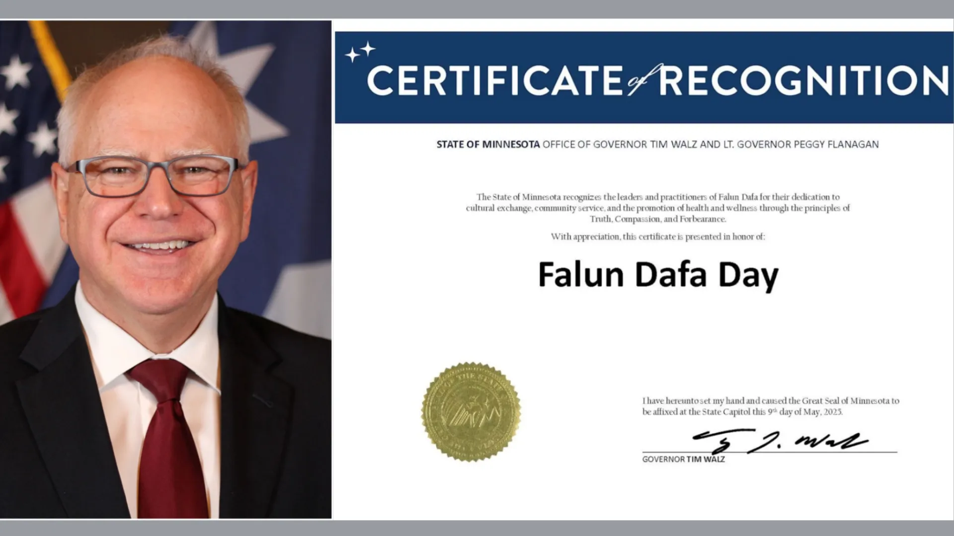 Thống đốc Minnesota, ông Tim Walz, cũng đã ban hành thông cáo, trong đó có viết: “Tiểu bang Minnesota khen ngợi những lãnh đạo và các học viên Pháp Luân Đại Pháp vì sự cống hiến của họ cho sự nghiệp thúc đẩy giao lưu văn hóa, phục vụ cộng đồng, lan tỏa những lợi ích sức khỏe thể chất và tinh thần thông qua nguyên lý ‘Chân-Thiện-Nhẫn’. Để bày tỏ lòng biết ơn, xin được trao tặng tuyên bố này để tôn vinh Ngày Pháp Luân Đại Pháp”.