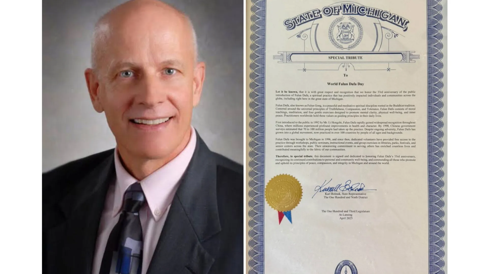 Hạ nghị sĩ tiểu bang Karl Bohnak đại diện cho Khu vực 109, đã trao bản tuyên dương đặc biệt để tôn vinh Ngày Pháp Luân Đại Pháp Thế giới: “Xin trân trọng thông báo rằng, với sự kính trọng và công nhận sâu sắc, chúng tôi tôn vinh lễ kỷ niệm 33 năm ngày Pháp Luân Đại Pháp hồng truyền, môn tu luyện đã có ảnh hưởng tích cực đến các cá nhân và cộng đồng trên toàn cầu, trong đó có cả ở tại tiểu bang Michigan vĩ đại này”.
