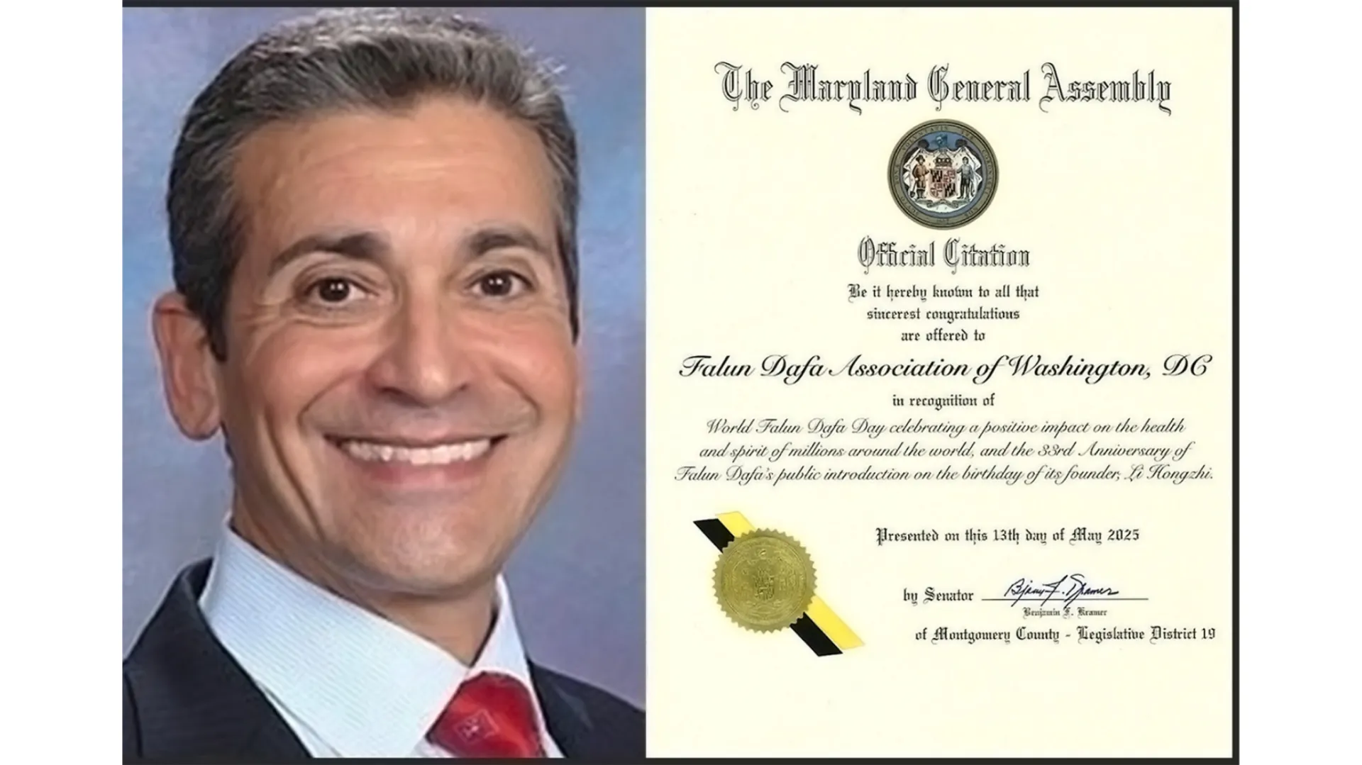 Thượng nghị sĩ Tiểu bang Maryland Benjamin F. Kramer đã viết trong giấy khen đặc biệt của ông: “Xin được gửi những lời chúc mừng chân thành nhất đến Hiệp hội Pháp Luân Đại Pháp Washington, DC để vinh danh Ngày Pháp Luân Đại Pháp Thế giới, chúc mừng những ảnh hưởng tích cực đến sức khỏe và tinh thần của hàng triệu người trên khắp thế giới và Lễ kỷ niệm 33 năm ngày Pháp Luân Đại Pháp được giới thiệu ra công chúng vào ngày sinh nhật của Đại sư Lý Hồng Chí, nhà sáng lập Pháp Luân Đại Pháp”.
