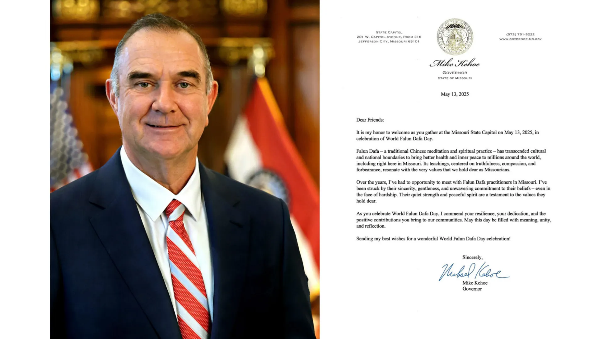 Thống đốc Missouri, ông Mike Kehoe, đã gửi thư chúc mừng: “Tôi rất vinh dự được chào đón nhân dịp các bạn tề tựu tại Tòa nhà Quốc hội Tiểu bang Missouri vào ngày 13 tháng 5 năm 2025 để kỷ niệm Ngày Pháp Luân Đại Pháp Thế giới.“