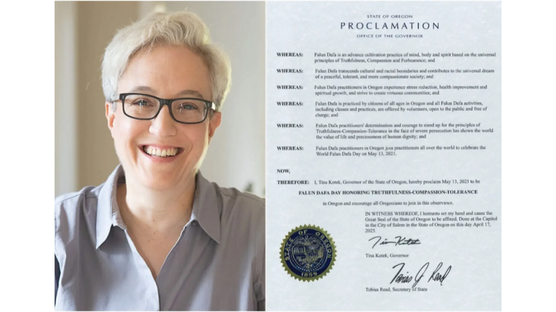 Thống đốc Oregon, bà Tina Kotek, đã viết trong tuyên bố tôn vinh Ngày Pháp Luân Đại Pháp của mình: “Pháp Luân Đại Pháp vượt qua các ranh giới văn hóa và chủng tộc, đóng góp vào ước mơ của toàn nhân loại về một xã hội hòa bình, khoan dung và lương thiện hơn… Sự quyết tâm và dũng khí của các học viên Pháp Luân Đại Pháp khi đối mặt với cuộc bức hại tàn khốc để bảo vệ nguyên lý ‘Chân-Thiện-Nhẫn’ đã cho thế giới thấy sự trân quý của sinh mệnh và phẩm giá con người”.